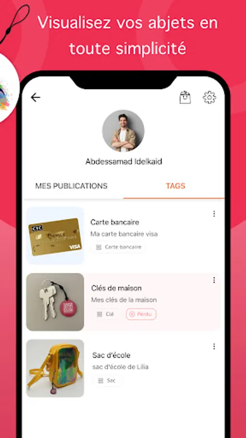 RETROUVEZ VOS CLÉS, PORTEFEUILLES, SAC, CARTE BANCAIRE, PIECES D’IDENTITE ET BIEN PLUS: nos tags sont de toute petite taille et s'attachent ou se collent facilement à vos objets.