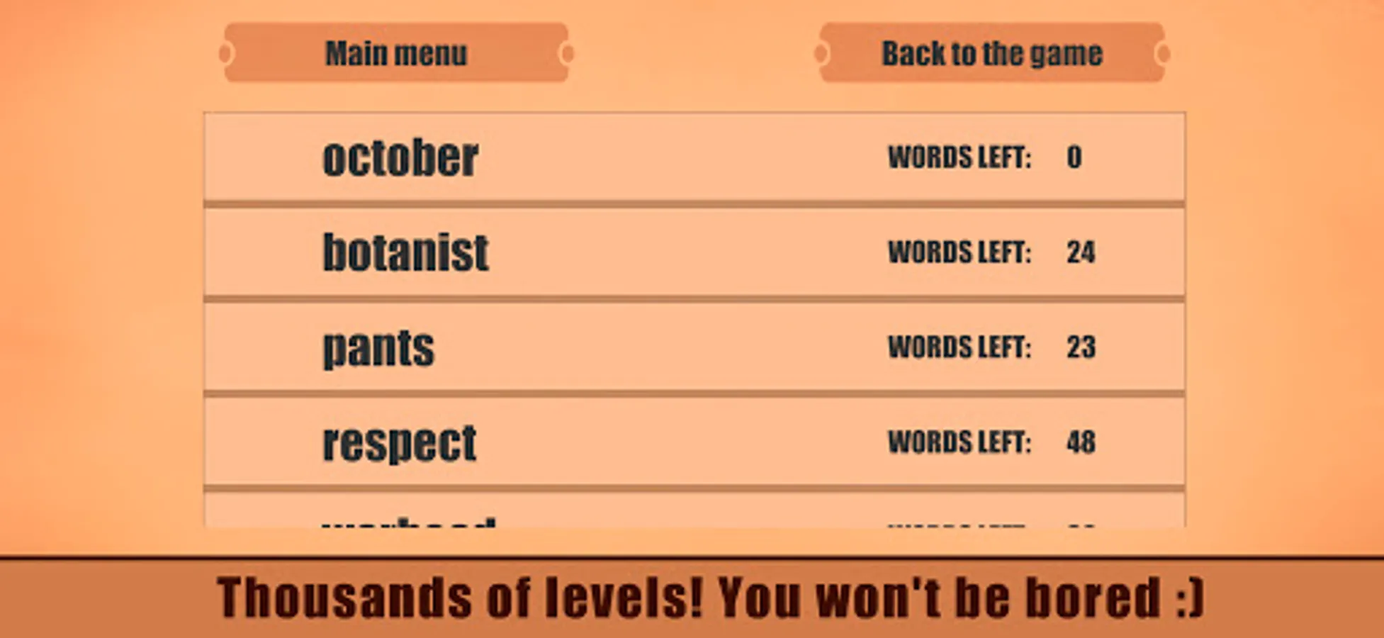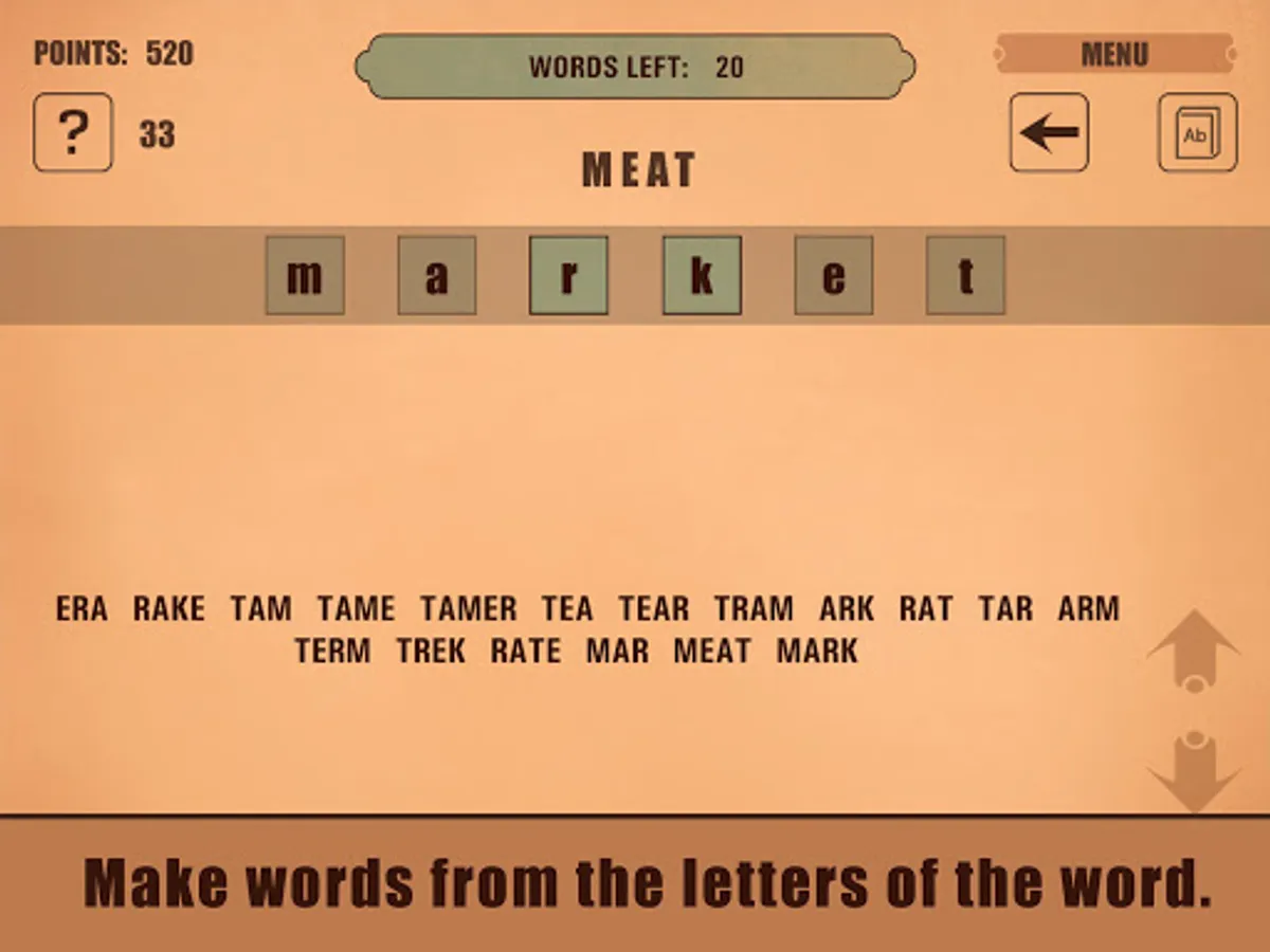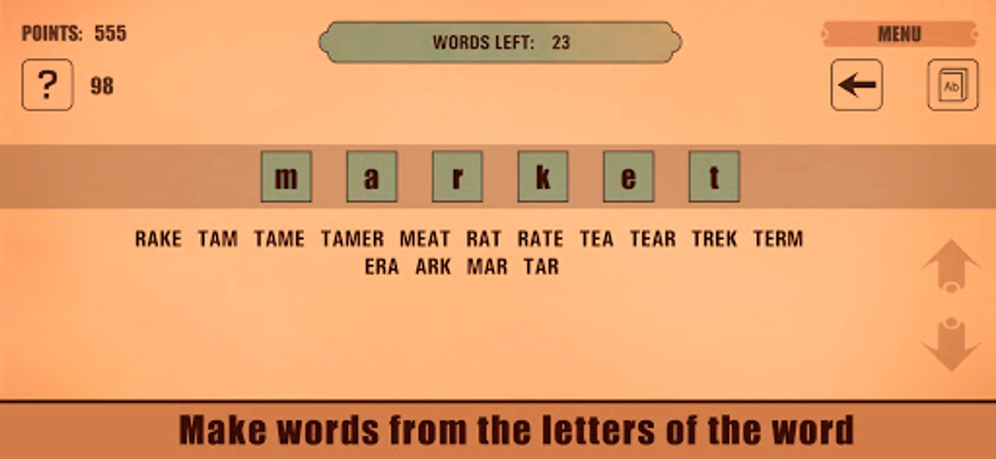 The game consists of levels, each level is a new word. Making words from words, you gain points - each letter made up of words, this one point.