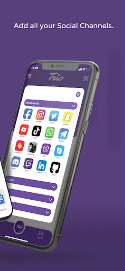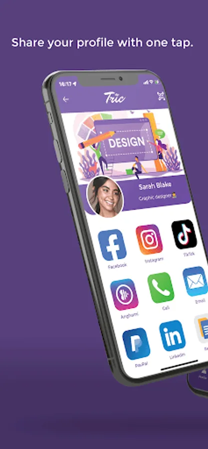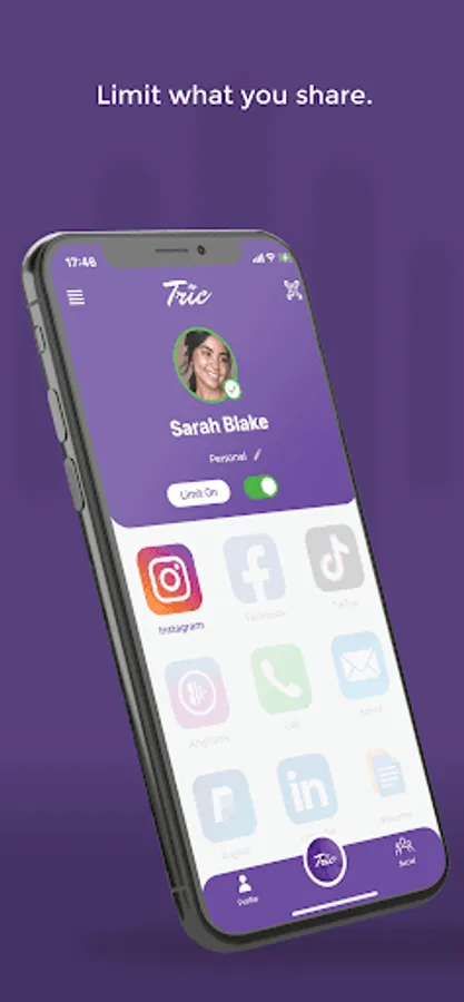 In our Tric app, you can create unlimited profiles with different info using one tag. You can create a profile for personal info, business info, and more, and customize them as you want. Our app allows you to easily and quickly manage your profiles and choose which one to share. You can also turn limit button on to only share one link at a time instead of sharing your whole profile