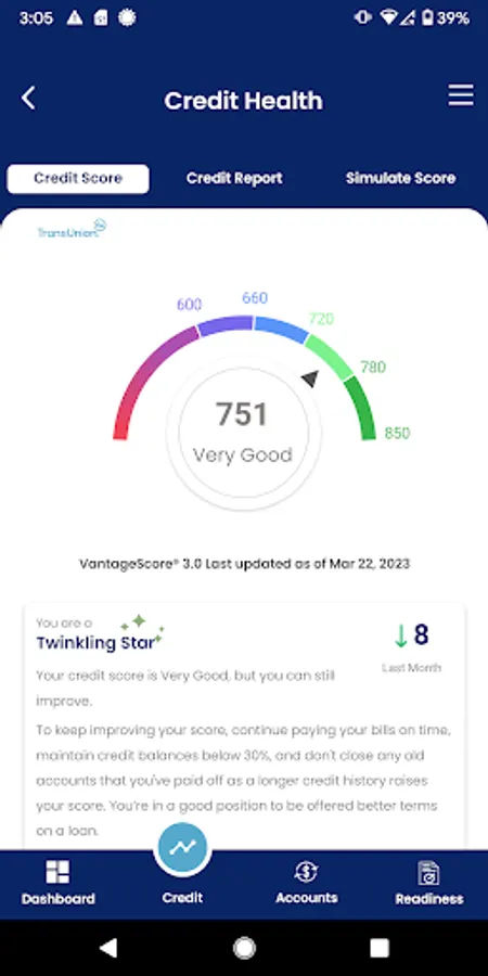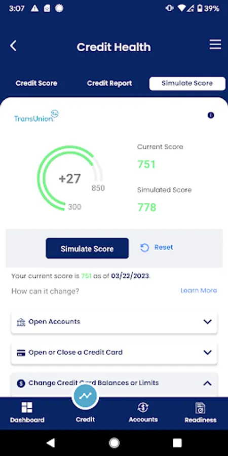 Your credit score is prominently displayed in your dashboard - and it doesn't cost you anything. Track changes month to month and learn the key factors that make up your score like length of credit, timely payment history, utilization of credit, total accounts opened and inquiries. Don't worry, this is a "soft credit pull" meaning there is no impact to your score by checking it. Look through your credit report for accuracy. Access helpful articles that explain credit bureaus, credit score, and more.
