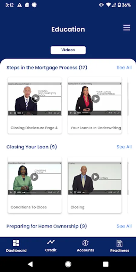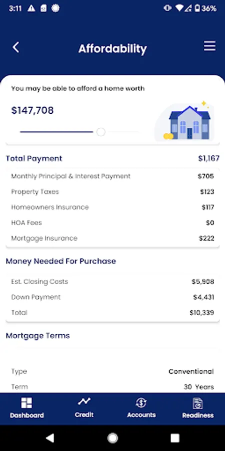 Work with your financial partner or institution to best prepare you for home ownership by planning for a down payment, establishing reserves, managing your debt to income ratio, improving or maintaining your credit, loan scenarios through our calculators, establish your projected loan to value, and more. Visit the readiness assessment in your app to see a snapshot of your credit overview, debt to income ratio, cash reserves, employment, down payment and sales price.