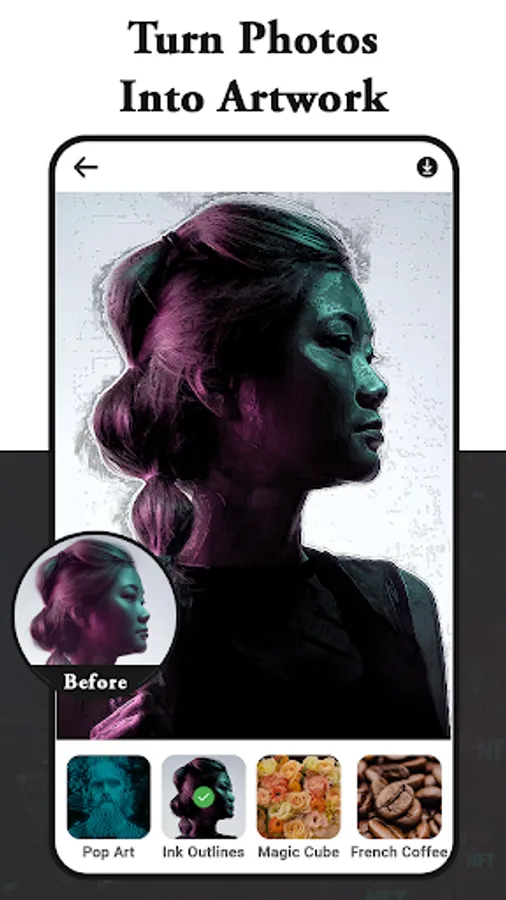 NFT Art Maker In a few steps, you can transform normal or ordinary photos into real crypto art photos. Single tap to convert your photos into artistic works like those painted by Picasso, Van Gogh, Monet, and other masters, bringing your photography a new style.
