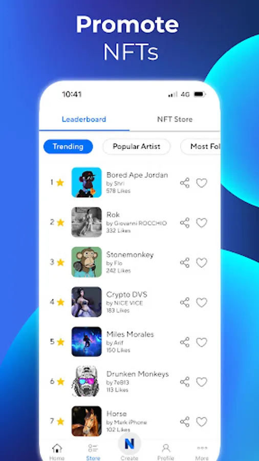 Collect NFTs and share them with other users. Discover the rankings of the most trending users and artists.