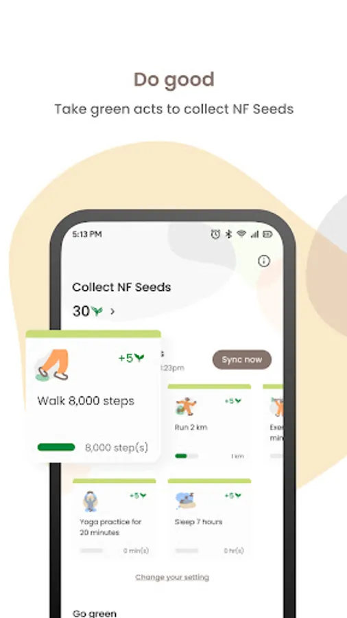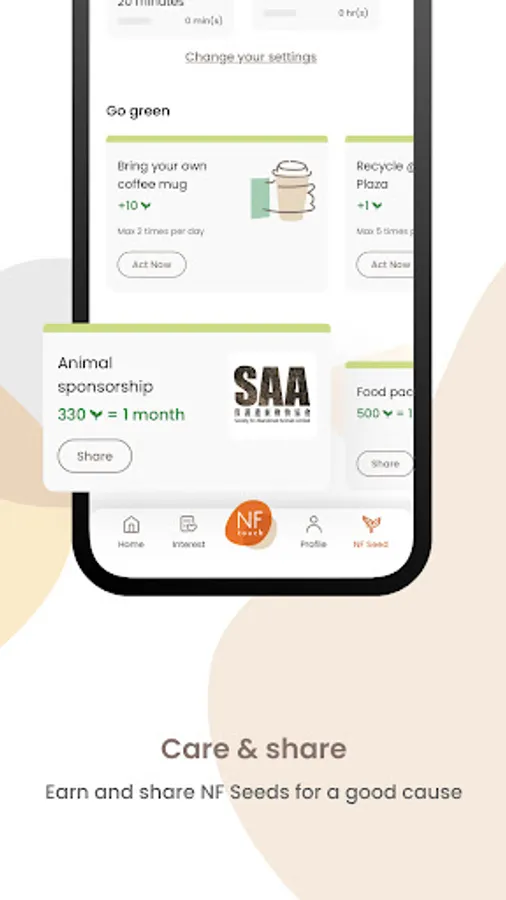 NF Touch encourages you to do good for yourself and for the community. As an NF Touch member and by living a green and healthy lifestyle, you can earn and share NF Seeds with NGOs to create big impacts by completing wellness and sustainability goals including: