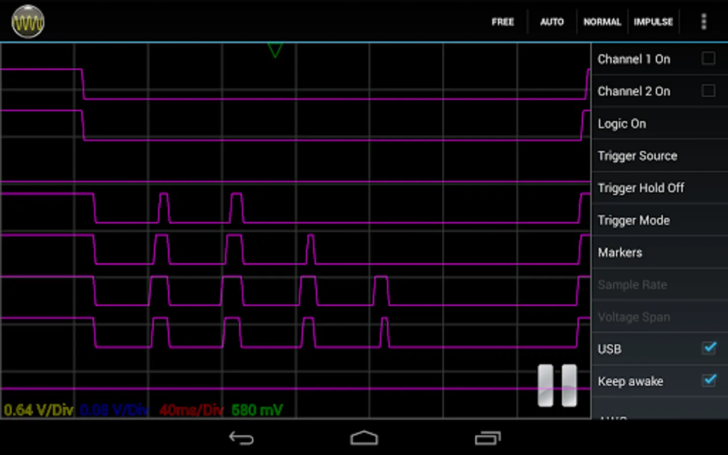 The newest and best input option is a USB hardware device provided by Gabotronics. USB host mode has now been compatible since android 3.1, therefore most new phones and tablets will support USB host mode (Please check device). NFX Oscilloscope supports the Gabotronics Xprotolab/Xminilab, this has 2 analogue input channels and 8 digital channels and measures a tiny 2.5 x 4 cm!! The device it's self is a cheap portable alternative to most mainstream oscilloscopes, and has many different features. Connecting the Xprotolab to the NFX Oscilloscope provides a powerful and cheap oscilloscope platform for your portable needs. For more information on the Xprotolab or Xminilab click the following links.