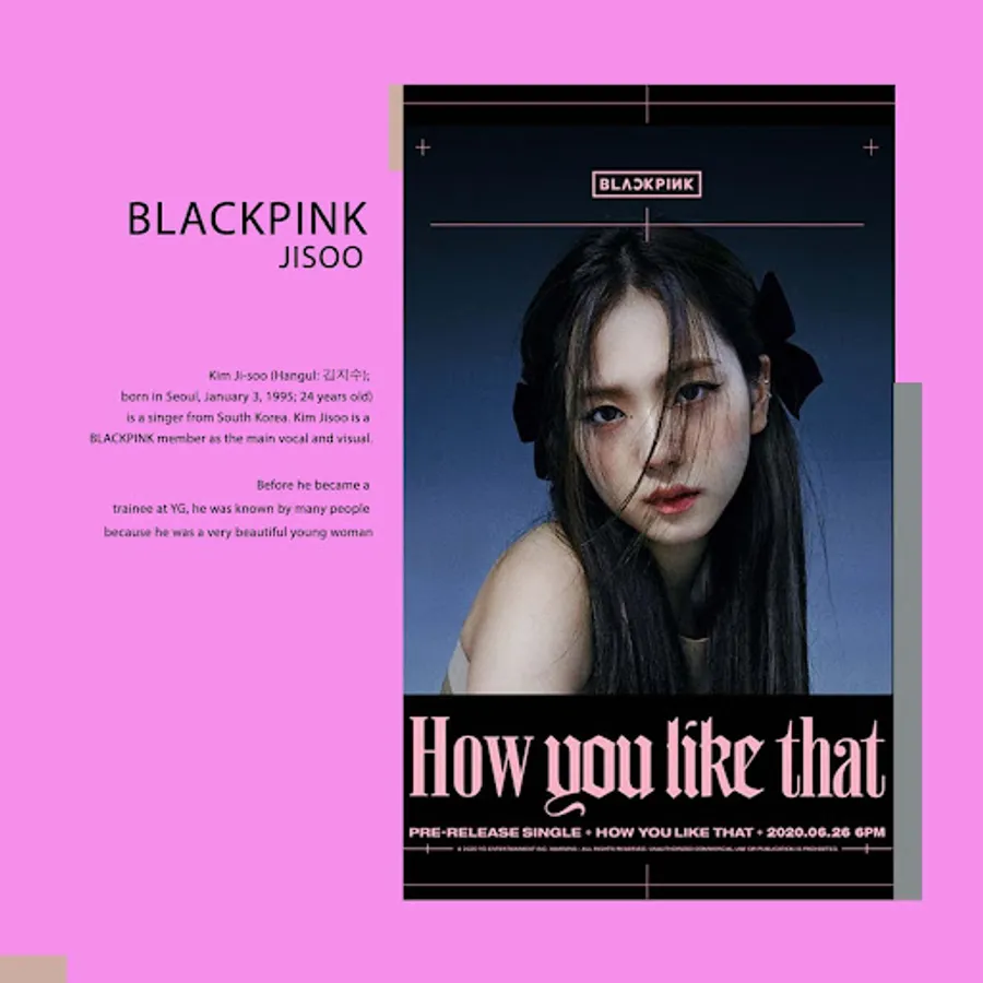 Kim Ji-soo (Hangul: 김지수); born in Seoul, January 3, 1995; 24 years old) is a singer from South Korea. Kim Jisoo is a BLACKPINK member as the main vocal and visual.
