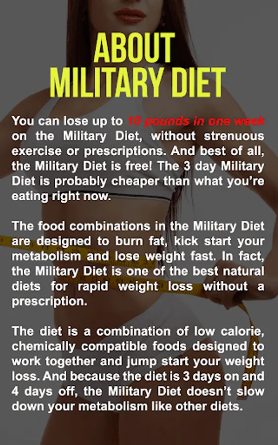 The Military Diet is a 3-Days plan diet that claims to may lose up to 10 pounds in a week if you follow respectively to the menu plan. These types of diet help to burn fat and lose weight faster without doing any physical exercise or workouts.