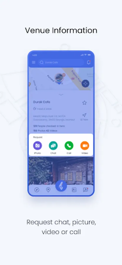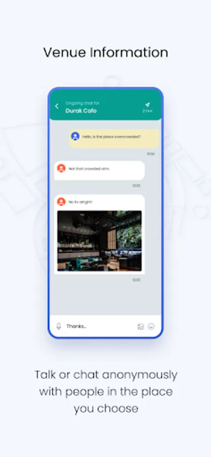 Communicate anonymously and securely via Chat, Pictures, Videos, and Calls. Check in to your current location and socialize anonymously. Chat with people around the world and explore venues and cities! Start by searching for your favorite place and requesting a chat, photo, video, or call.