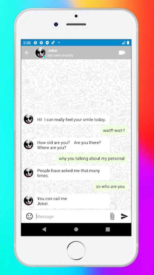 Joker fake video call is a simple application is very professional application to make call video with your hero Joker chat call and fake video call with a simple live chat, Enjoy calling Joker chat in an easy way, feel free and download this Joker video call for have fun with friend. Joker video Call, Today you can prank your friends and joke with them, Connect to Joker fake chat by clicking on the fake chat button and have fun with Joker call with your friends.