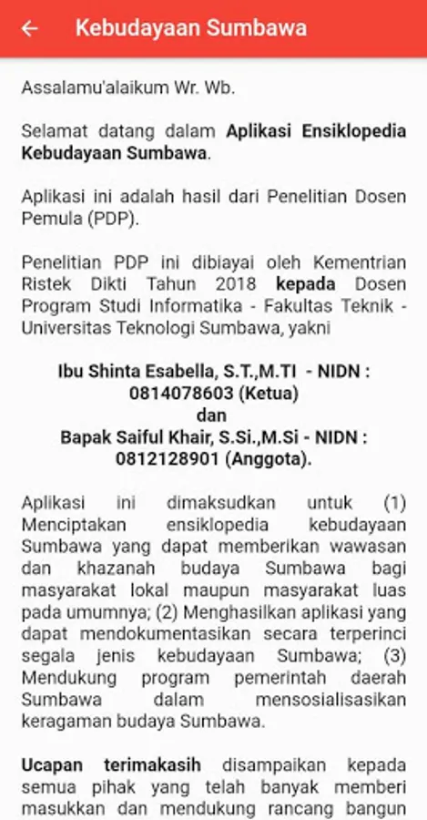 The Sumbawa Cultural Encyclopedia is an application that explains information about Sumbawa culture, which aims to maintain the integrity of the Sumbawa cultural heritage.