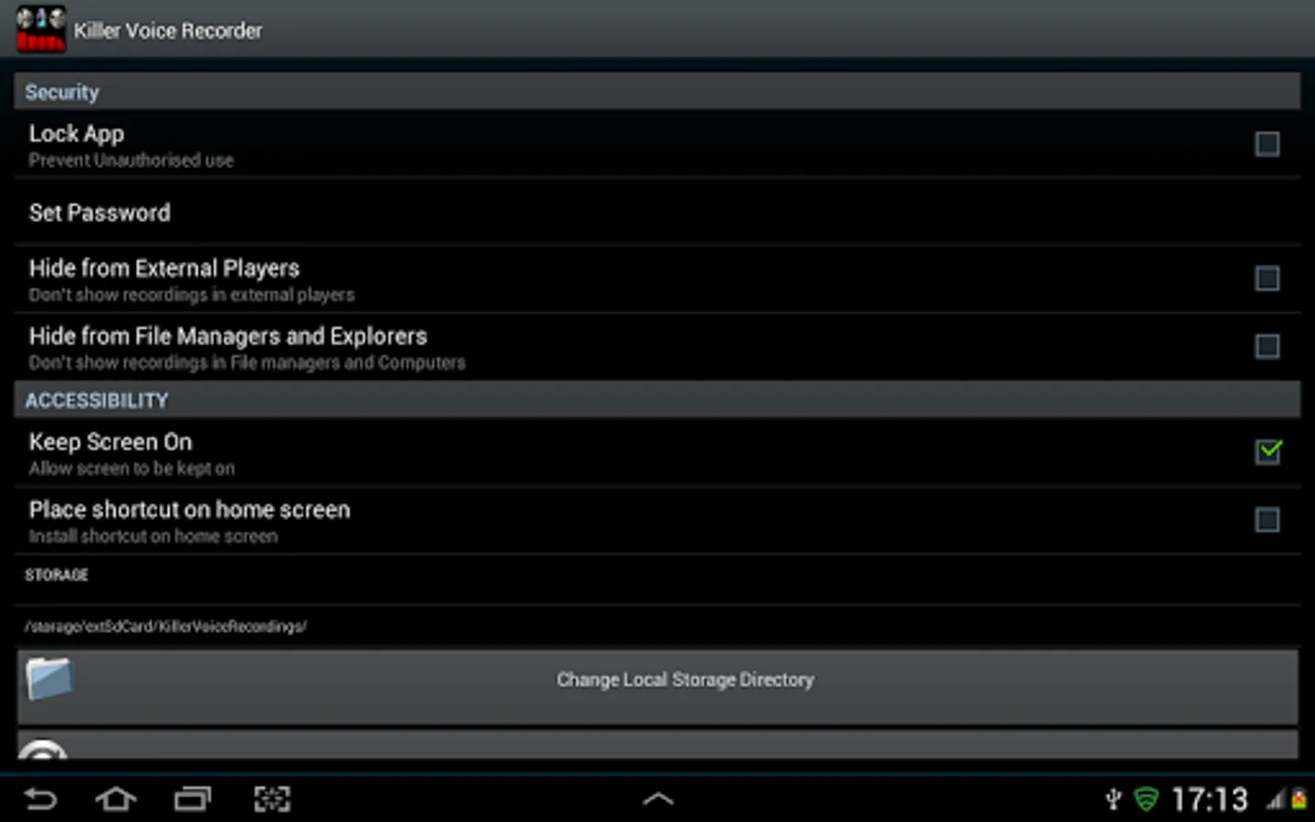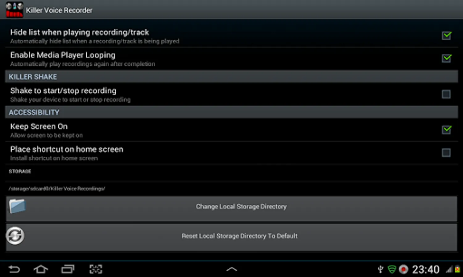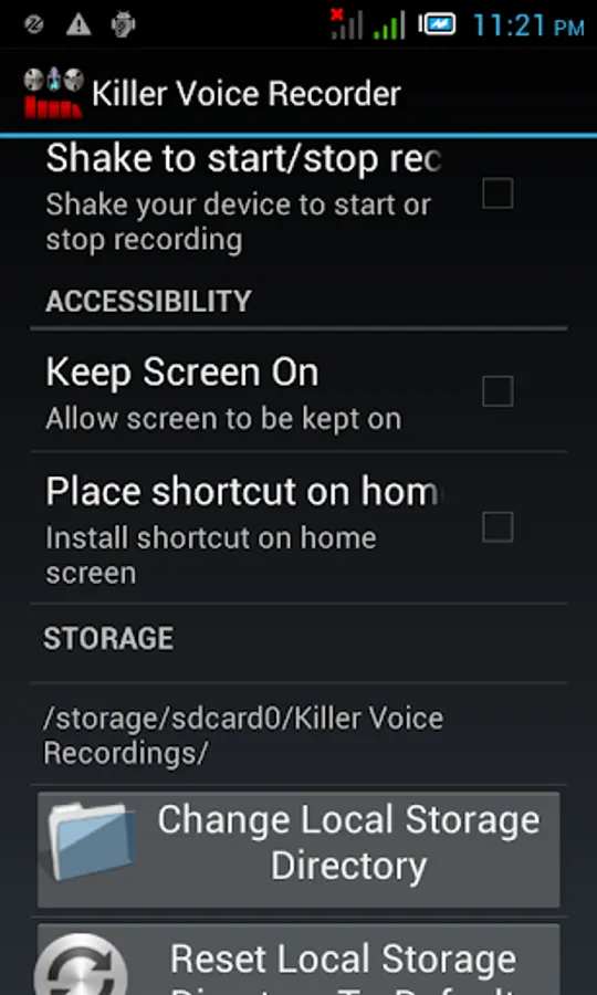 ★ STORAGE AND DIRECTORY CHANGE – You can choose a particular directory to save recordings. Default is sdcard/Killer Voice Recordings.
