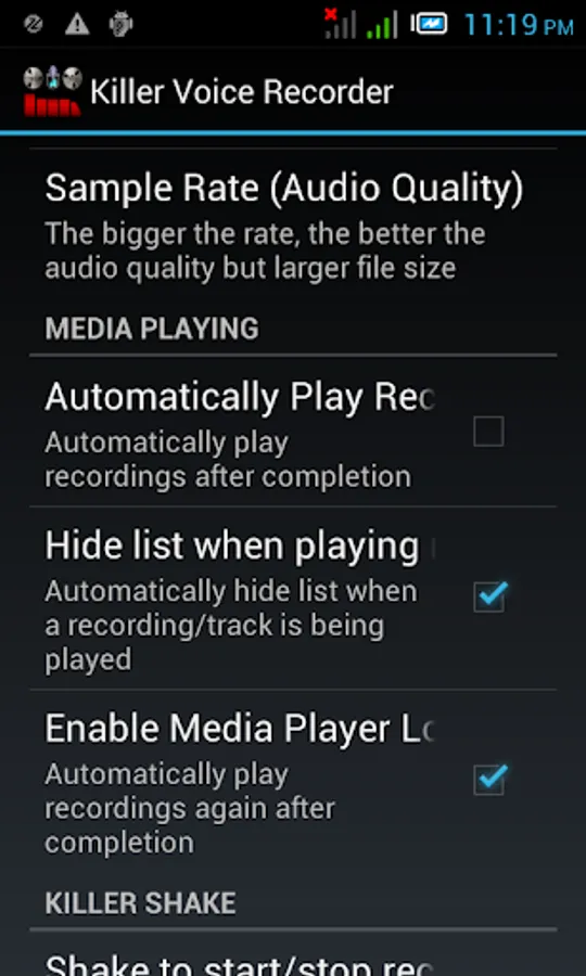 ★ KILLER SHAKE – No need to launch the app when you want to record. Just shake your device to start recording and shake to stop and save recording. Very useful to detectives/journalists/interviewers etc.