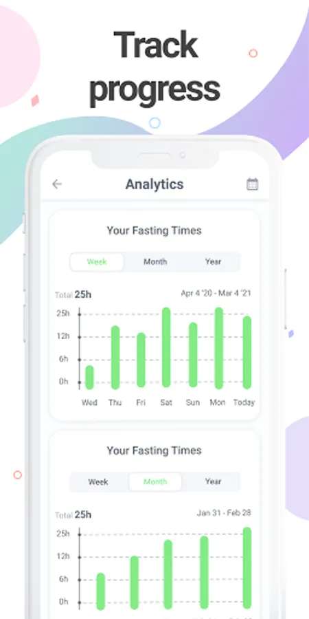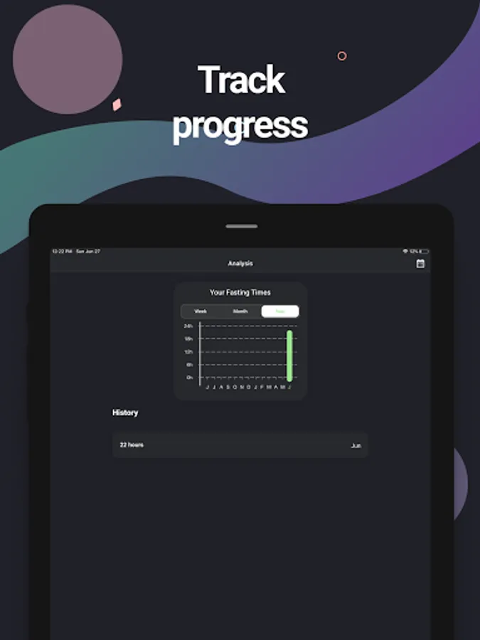 In analysis tab you can see your progress for last week, quarter, year. Also you can track how many hours you fasted during these periods of time with detailed statistics.