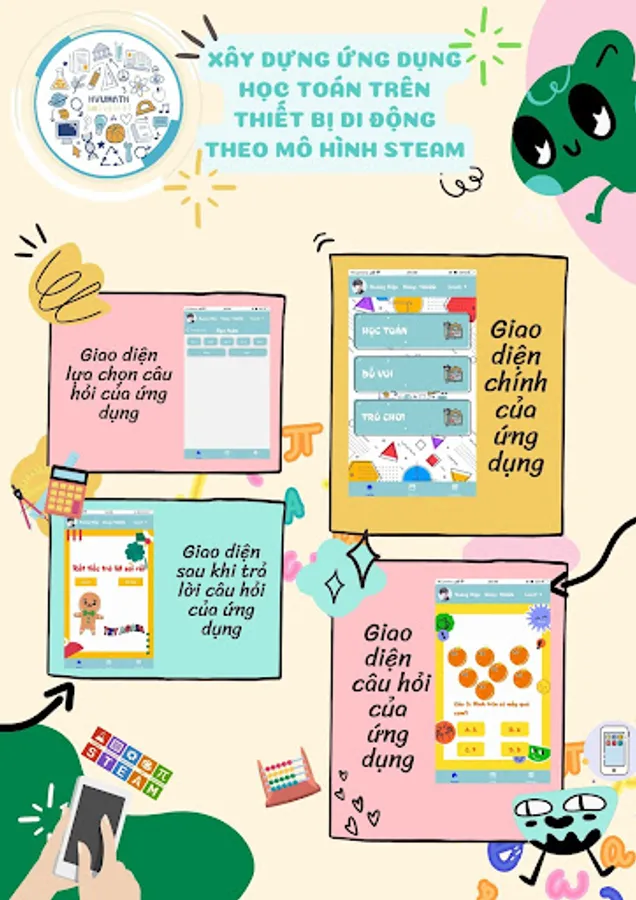 “Ứng dụng học toán trên thiết bị di động theo mô hình STEAM” là một ứng dụng học toán mới mẻ tuy nhiên đem lại nhiều lợi ích cho các em học sinh. Giúp các em có thể ghi nhớ lý thuyết và bài tập trên lớp. Tăng khả năng vận dụng thực hành hiệu quả, khả năng tư duy logic, cùng nhiều các kỹ năng khác nhau.