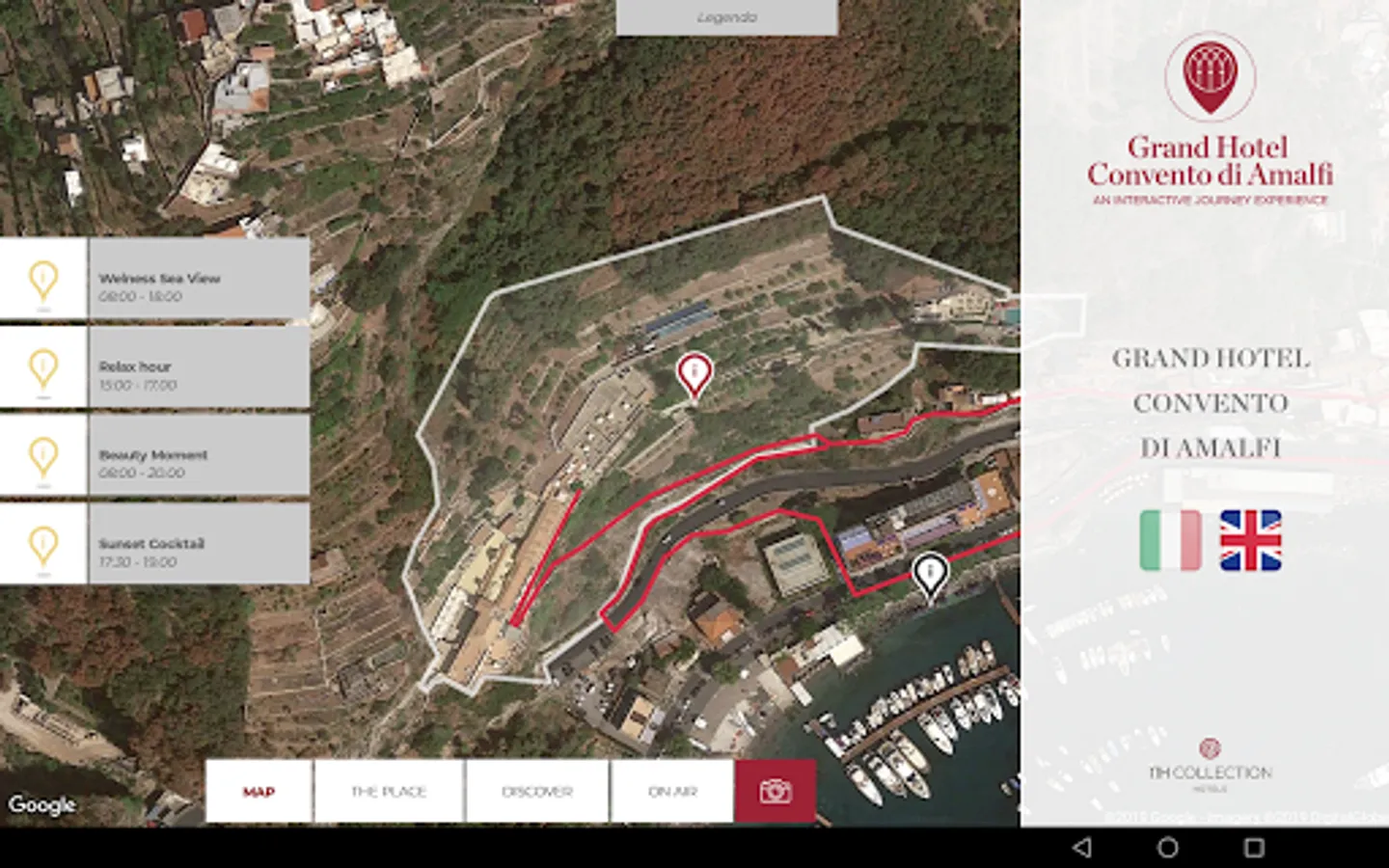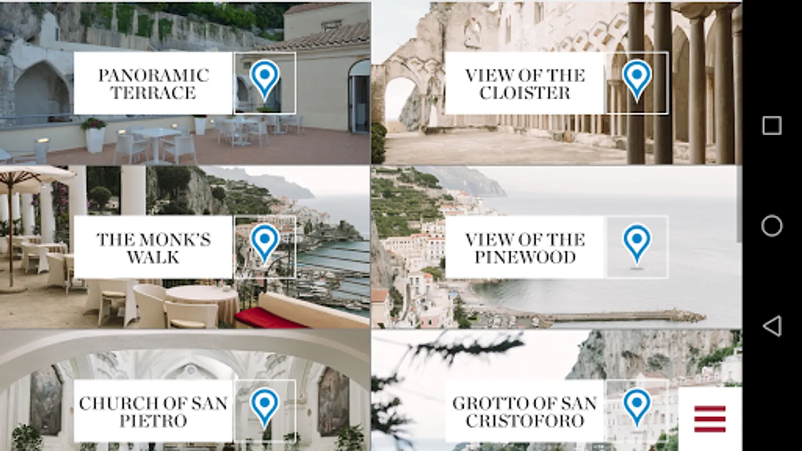 Map. Discover the map and navigate through the different levels of the architectural complex including indoor and outdoor spaces, living your experience until the city of Amalfi and the routes to the nearby islands. The markers on the map allows you to find out historical, botanical, architectural and cultural points of interest and to appreciate the whole cultural value of the hotel and its surroundings. These “pins” are also visually marked along the different paths inside the hotel and, thanks to their Bluetooth iBeacon technology, will alert you when you’ll be physically close to a point of interest to be discovered.