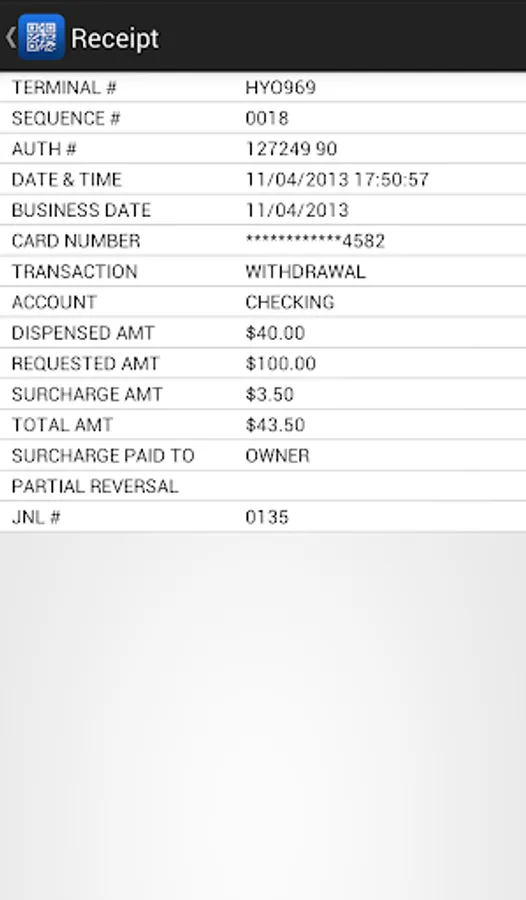 Paperless receipt is realized by DigitalReceipt with Nautilus Hyosung's next-gen ATMs. DigitalReceipt enables the users to capture a QR code receipt for the transaction and then displays the receipt on a mobile device. DigitalReceipt utilizes ZXing ("Zebra Crossing") which is a QR code decoding library, AChartEngine which is a charting software library, and SwipeListView for drawable cells and swipe features on Android List View.