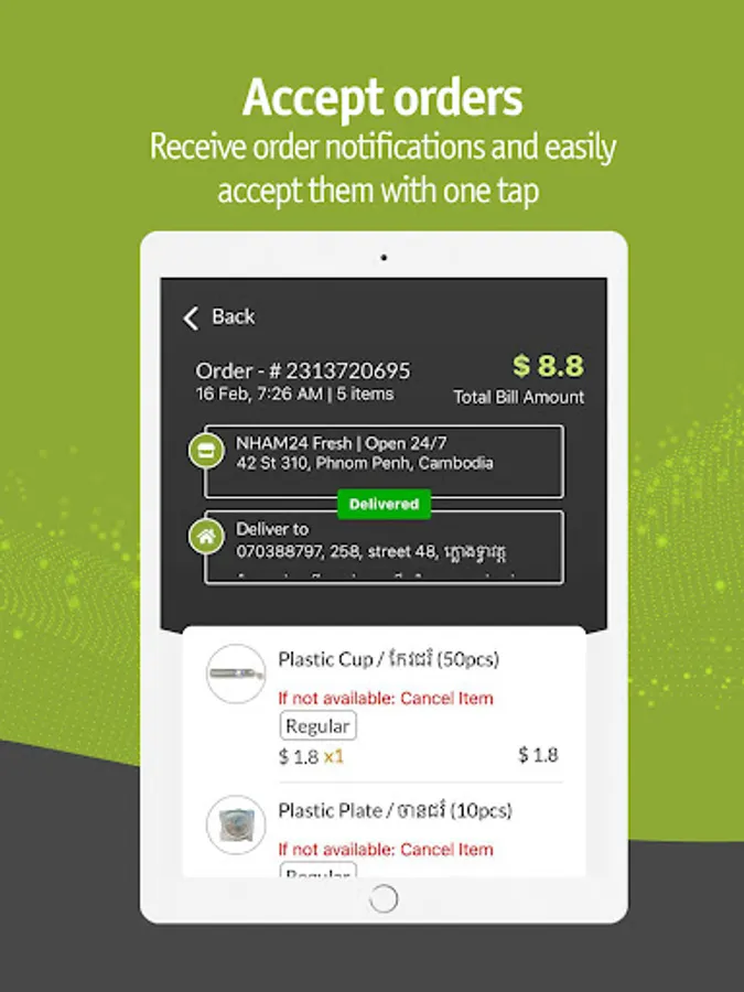 This app lets NHAM24 restaurant partners to manage their order, table booking as well as sending a real-time notification to customers on the status of their orders. It also connects with NHAM24 Driver App for delivery dispatch and management.