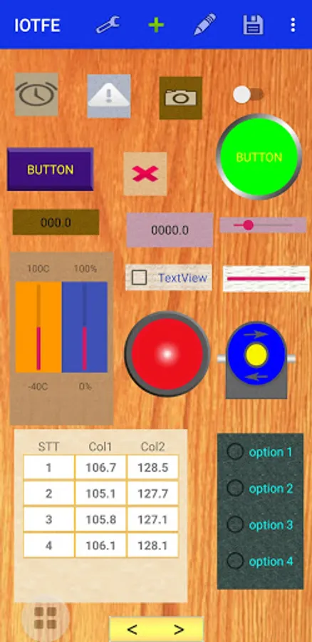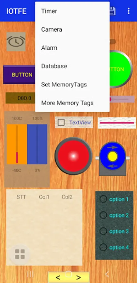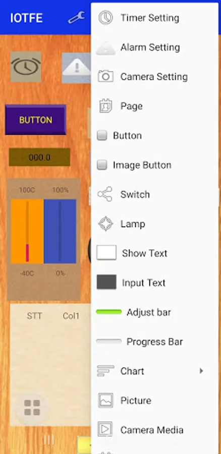 - Provide many useful tools such as Button ,Picture Frame ,Show Text ,Input Text ,Chart ,Database Table ,Camera ,Timer ,Alarm ,Thermal-Hygrometer ,Switch ,Note ,Adjust Bar ,Progress Bar ,Single Check ,Group Check ,Lamp ,List ,Design Page…..
