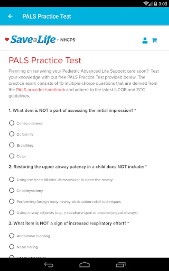 Test your ACLS, BLS, CPR, PALS, first aid and ECG knowledge and skills with our free practice tests. Each skills test consists of 10 multiple-choice questions that are derived from our provider ebooks and adhere to the latest guidelines.