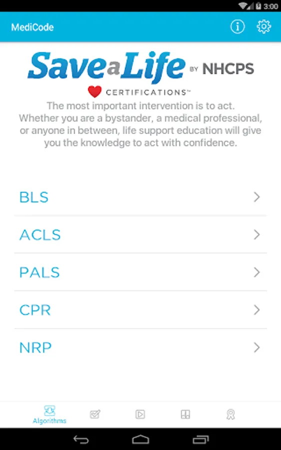 At Save a Life Certifications by National Health Care Provider Solutions (NHCPS), the premier provider for online certification and recertification courses, we believe that improvements can be made through providing exceptional education and resources. Save a Life by NHCPS has compiled a list of the vital Basic Life Support (BLS), Advanced Cardiac Life Support (ACLS), Pediatric Advanced Life Support (PALS), Neonatal Resuscitation (NRP) and CPR and first aid algorithms, all of which can be viewed and navigated with the touch of your finger.