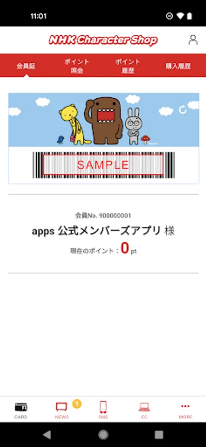 The "NHK Character Shop Official" app can be used not only as a membership card at the target stores, but also for the latest news and shopping at the online shop.