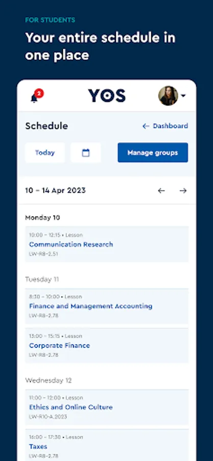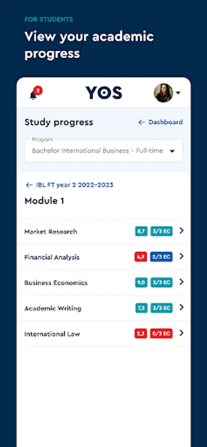 That's why we developed YOS. This app is designed to keep your studies structured and organized by bundling all essential study information into one user-friendly dashboard. Whether you want to consult your schedule, track your study progress, or get in touch with your study coach, with YOS it's all possible in one place.