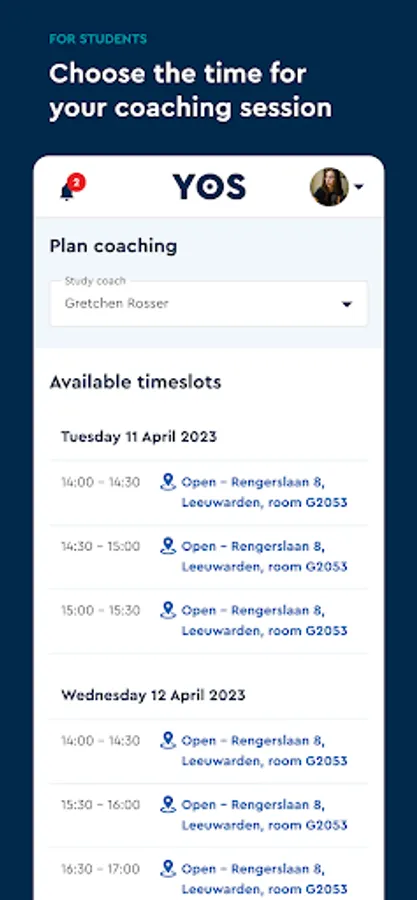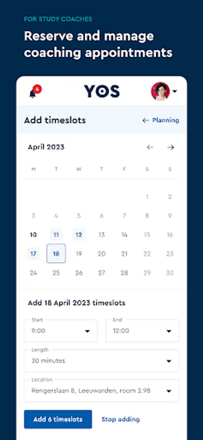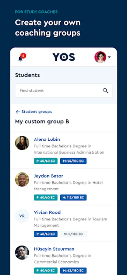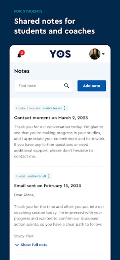 As a study coach, we understand how important it is to have a clear overview of all the critical information associated with the student you're coaching. With YOS, you get a comprehensive toolset to track study progress, simplify communication, capture and share notes with the student, schedule appointments, and receive alerts. You'll discover that YOS enables you as a study coach to provide even more effective support to your students.