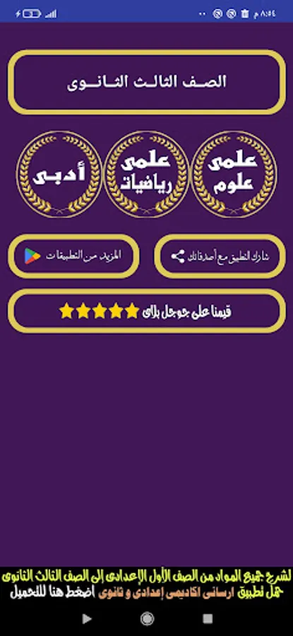 The application provides explanations, reviews, and summaries (videos and notes) for all subjects for high school (third secondary grade) in all its branches (mathematics, science, science, and literature).