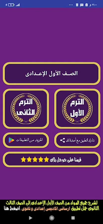 The application provides explanations, reviews, and summaries (videos and notes) for all subjects for the first grade of middle school for all Arabic and language schools.