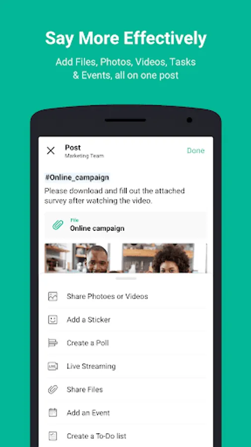 ● Work/Projects - Share files and keep everyone in the loop with the community board. Have a quick group call with remote teams. Hold everyone accountable with shared to-do lists.