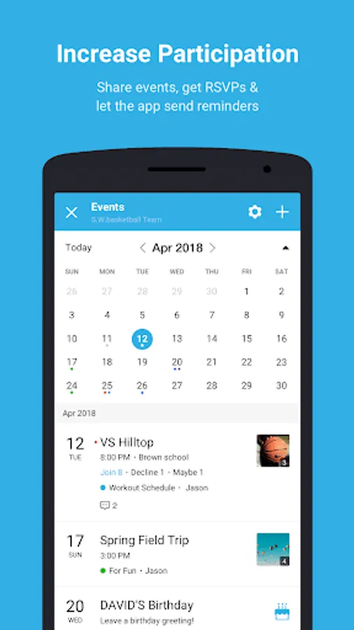 ● Sports Teams – Keep track of game days and team practices with the Calendar, send quick notifications about canceled practices, and share team videos and photos, all in one place.