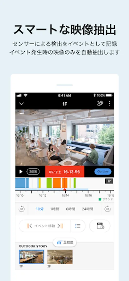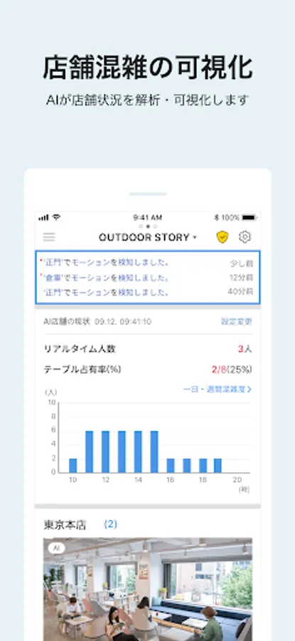 店舗に警備通知を設定しておけば、サウンドとモーションを検知し、リアルタイムで通知します。