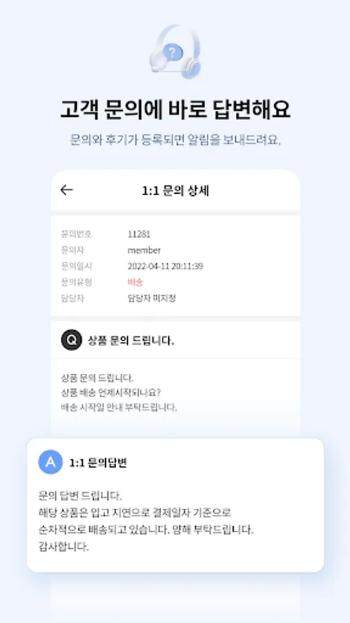 - Send a push when product inquiries and 1:1 inquiries come in. You can check the contents and reply directly from your mobile. Run a customer-friendly shopping mall with quick CS response.