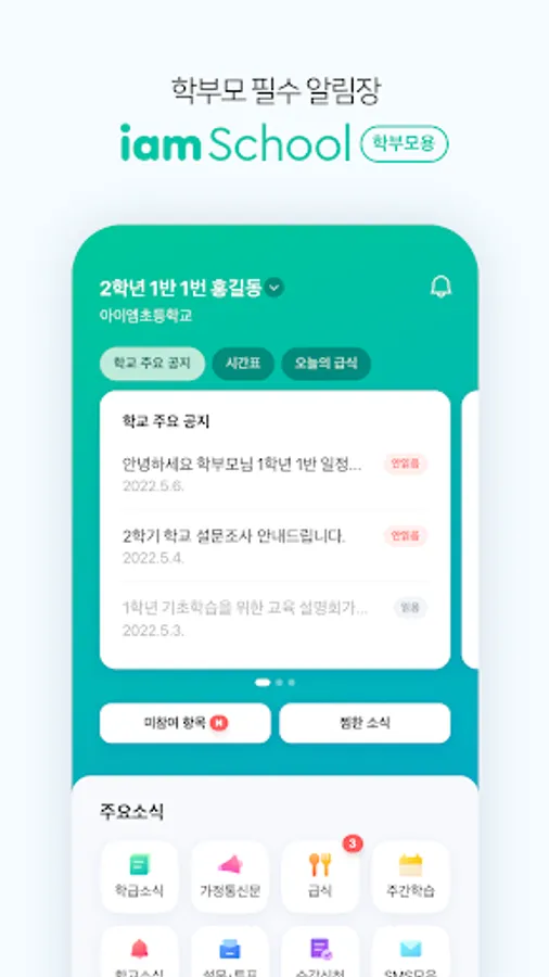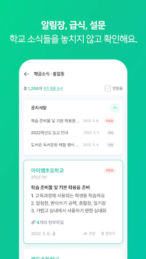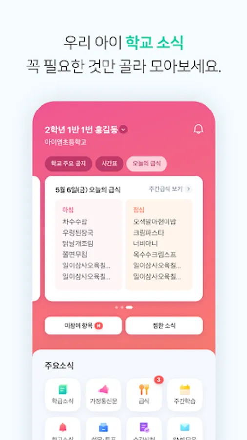 Check school announcements, home newsletters, meal news, and class announcements at a glance.