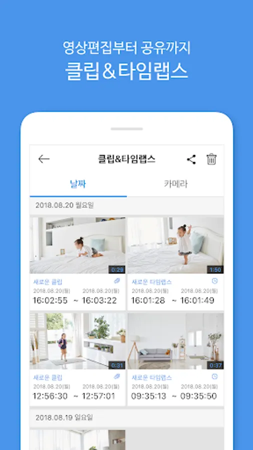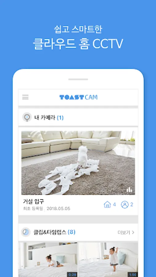Easy and smart CCTV Toast Cam is a smart IP camera service that allows you to view the past video and monitor the scene on a real-time basis using the camera installed at your home or work and receive alerts when the camera detects motions or sound!