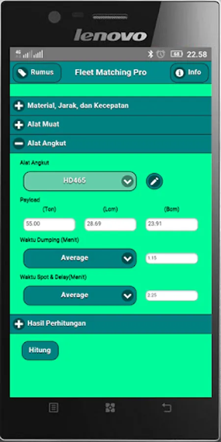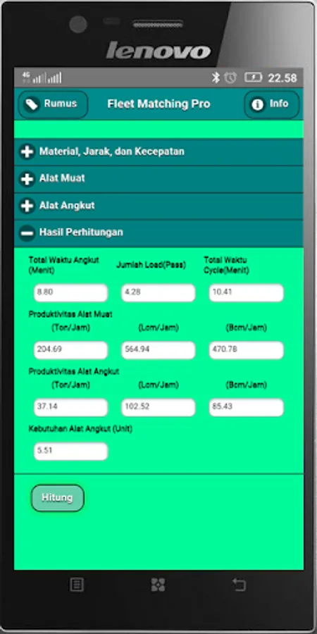 Matching Application to calculate Fleet Heavy Load them Productivity Tools, Productivity Tools Transport, and the need for transportation, based on the material hauling distances.