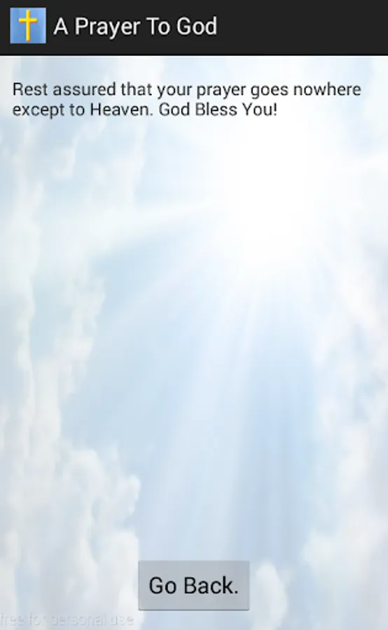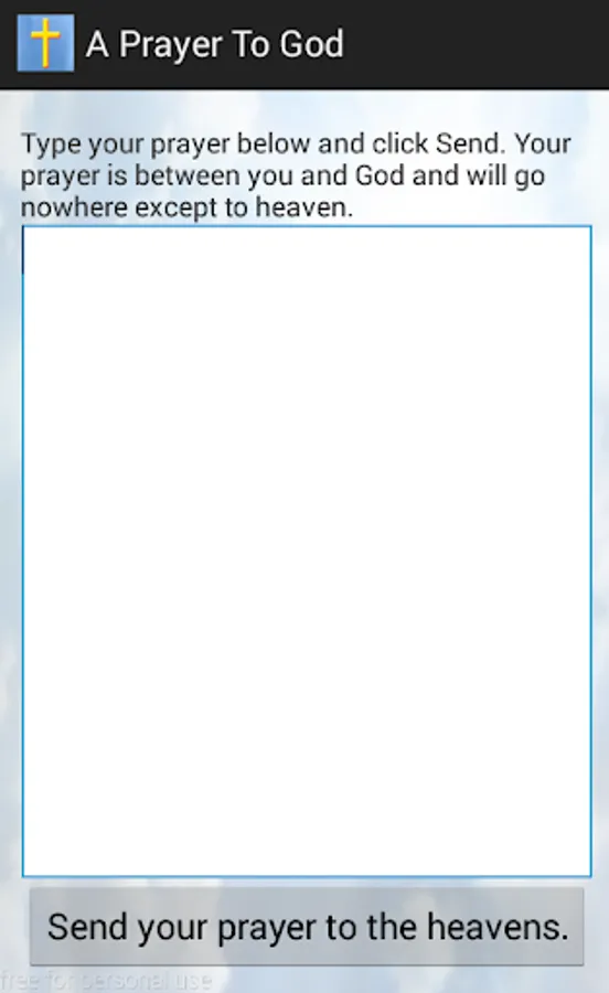 Just a simple program to let you type a prayer and send it to God. Sometimes it helps us to see our words and folks seem to relate to communication via cell phones a lot so this seemed appropriate. Your prayers go no where except to God who always hears you and loves you. May Gob bless you.