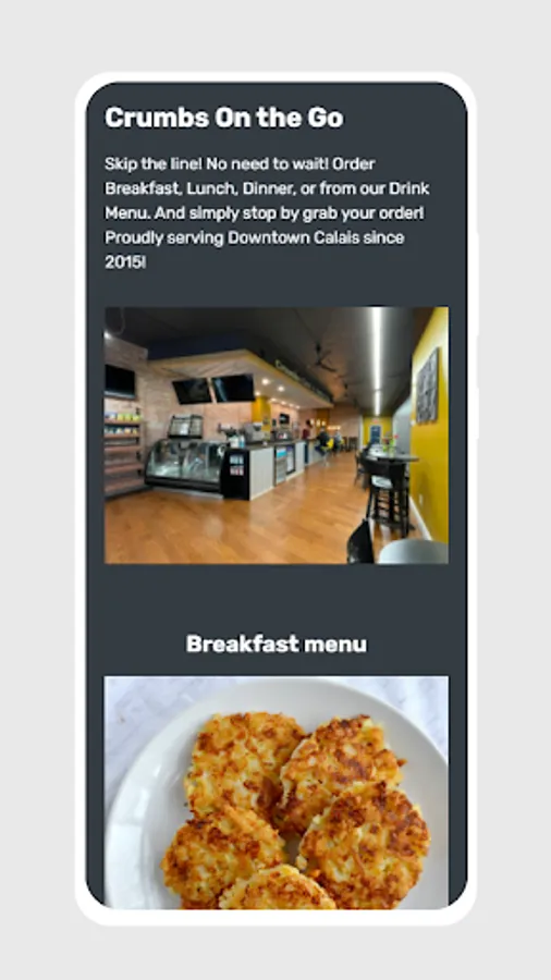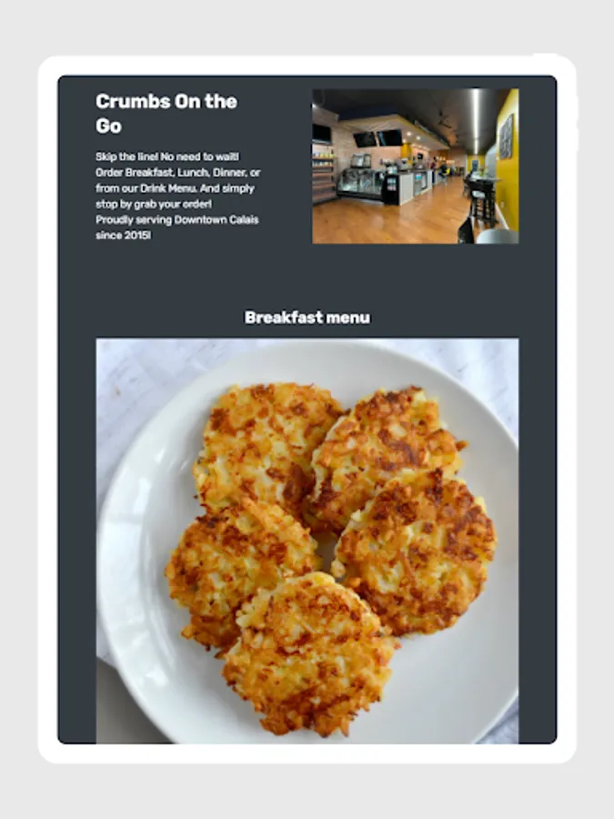 We are a café restaurant we serve breakfast lunch and dinner. Skip the line! No need to wait! Order Breakfast, Lunch, Dinner, or from our Drink Menu. And simply stop by grab your order! Proudly serving Downtown Calais since 2015!
