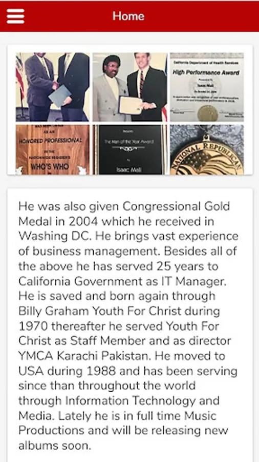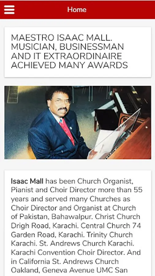 Isaac Mall has been Church Organist, Pianist and Choir Director more than 55 years and served many Churches as Choir Director and Organist at Church of Pakistan, Bahawalpur. Christ Church Drigh Road, Karachi. Central Church 74 Garden Road, Karachi. Trinity Church Karachi. St. Andrews Church Karachi. Karachi Convention Choir Director. And in California St. Andrews Church Oakland, Geneva Avenue UMC San Francisco, First Temple UMC Martinez , Community Presbyterian Church Vacaville, First Baptist Church Vacaville and many Churches as time to time. He produced the First ever Christian Tape in 1976 through EMI Karachi Pakistan. There after many.