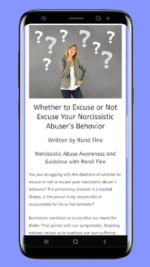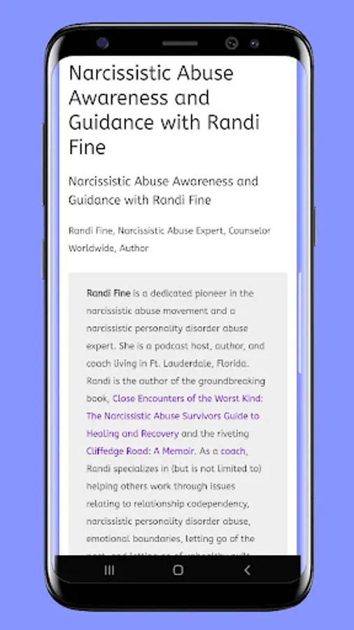 Are you suffering the frustrating, confusing, painful effects of narcissistic abuse? Are you a narcissistic abuse survivor seeking validation, compassionate guidance and support, and knowledge to help you work through this emotionally challenging, often crippling syndrome? Has conventional therapy failed you? Are you are ready to heal, take back your power, and move on to the life you deserve? If so you have come to the right place. Through a wide variety of resources, Randi Fine, world renowned narcissistic abuse expert, highly experienced professional coach, acclaimed podcast host, and published author provides a complete, clear roadmap to help you navigate the complex healing process. In a non-labeling, non-judgmental style Randi Fine, survivor of narcissistic abuse and a dedicated pioneer in the NPD Abuse Awareness movement offers this App as a comprehensive narcissistic abuse resource. You have hurt long enough. Now it is time to heal.