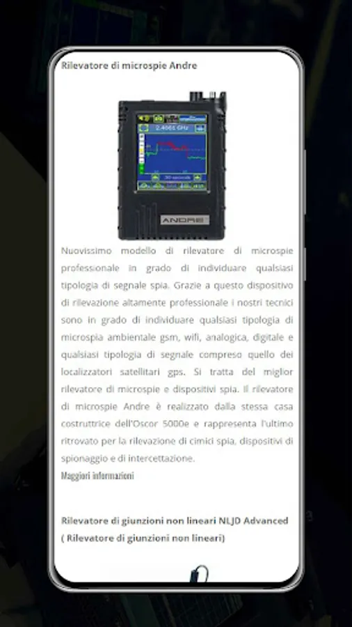 Micro cameras: Thanks to the camera detectors we can identify the target of any camera in any environment and we are also able to identify umts or wifi spy cameras.