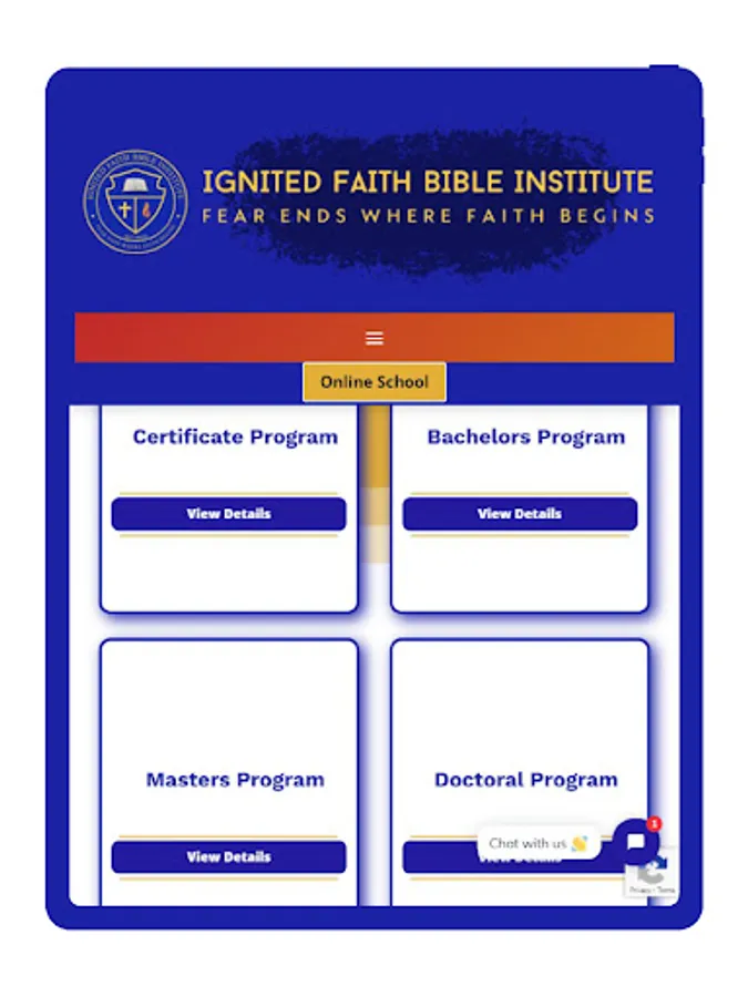 Ignited Faith Bible Institute is a Christian college holding the truth that the whole Bible is the inspired word of God. We were founded to make available affordable degrees in Theology, Biblical Studies, Ministry, Christian Counseling and Christian Education. The institution and curriculum are totally Bible centered and based. The Bible will always be the center of all our course studies. Please feel free to contact us if we can be of assistance in any way.