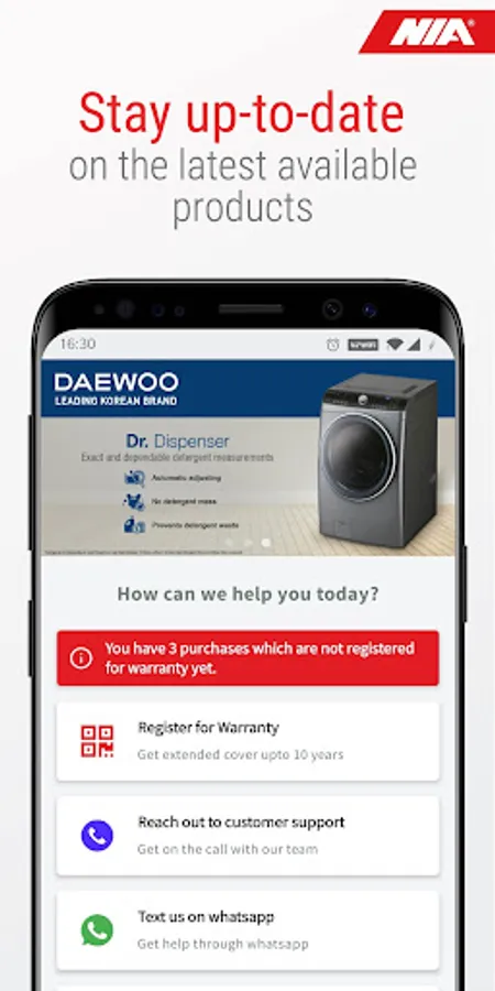 The NIA app is your one point contact for the care of Blueair - air purifiers, Daewoo - home appliances, and Gree - Air Conditioners in the UAE.