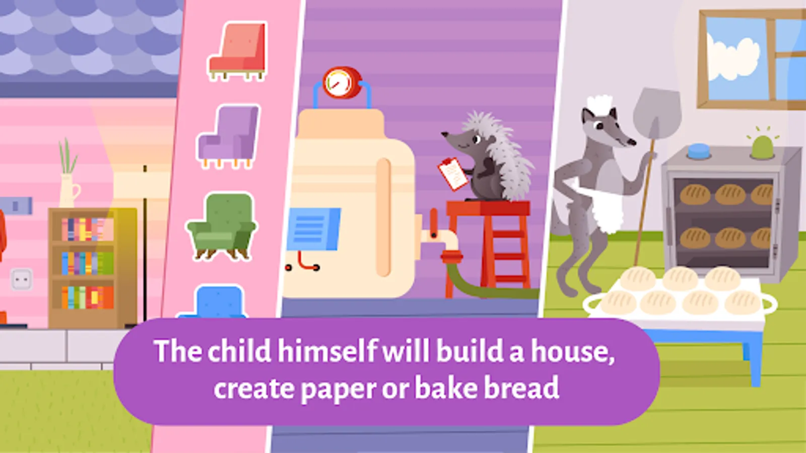In "Squirrel Academy - kids games" there is a map of the city and its environs, on which there are factories and factories for the production of things familiar to the child. Choosing the production of bread, the kid, together with the squirrel Tisha, studies the whole process of its creation - sows wheat, takes care of the harvest, collects mature grains, takes them to the mill, bakes bread, delivers it to the store and sells it to the buyer. The entire gameplay is accompanied by sound and visual prompts, involving the child - you need to drag objects, press buttons, switch toggle switches, which perfectly develops fine motor skills. The game was created for children, so it is impossible to lose in it - no children's tears and disappointments! And additional game tasks keep the attention of children and develop observation skills!