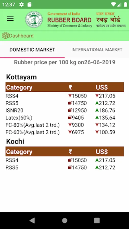 'Rubber Market Trendz’ is a mobile initiative by Rubber Board for collecting of daily price of rubber from various sources in India and for its compilation and dissemination. This is an initiative for speedy collection of rubber price using good sample sizes for better reliability. The mobile app has to be downloaded and registered for use. User will be activated and authorized based on verification. Current version supported is Android.