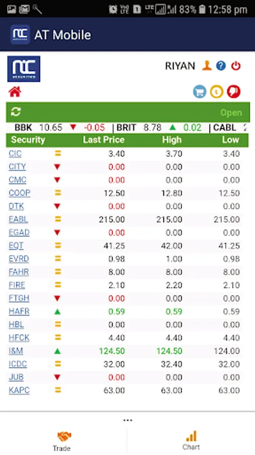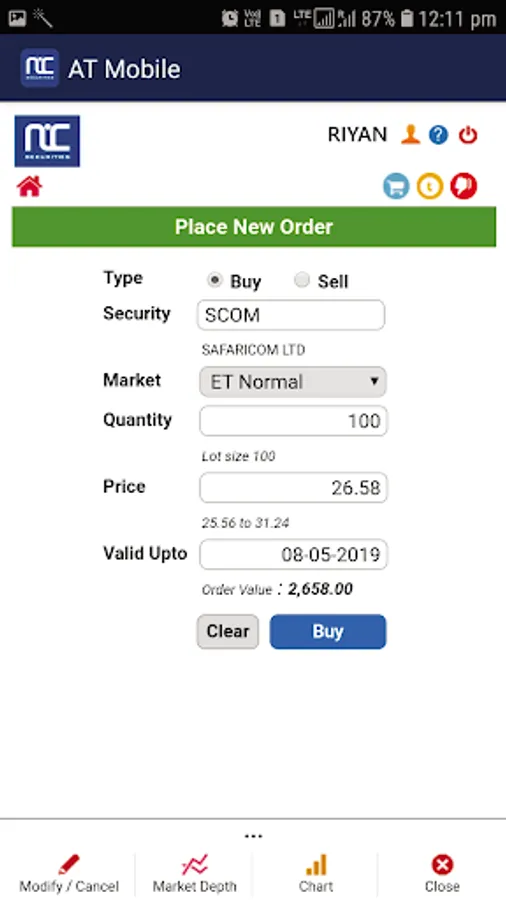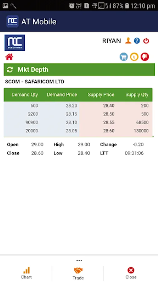• Market depth (Order book) for selected stock showing top 5 bids and offers