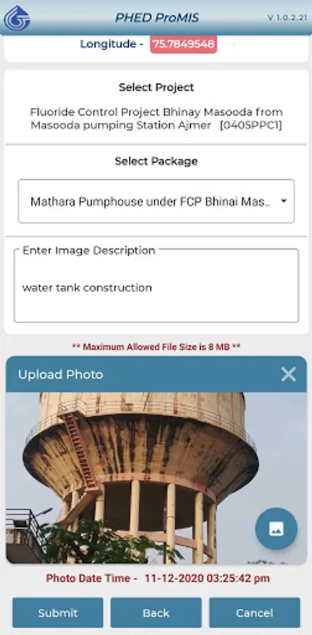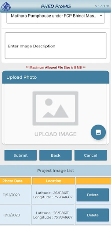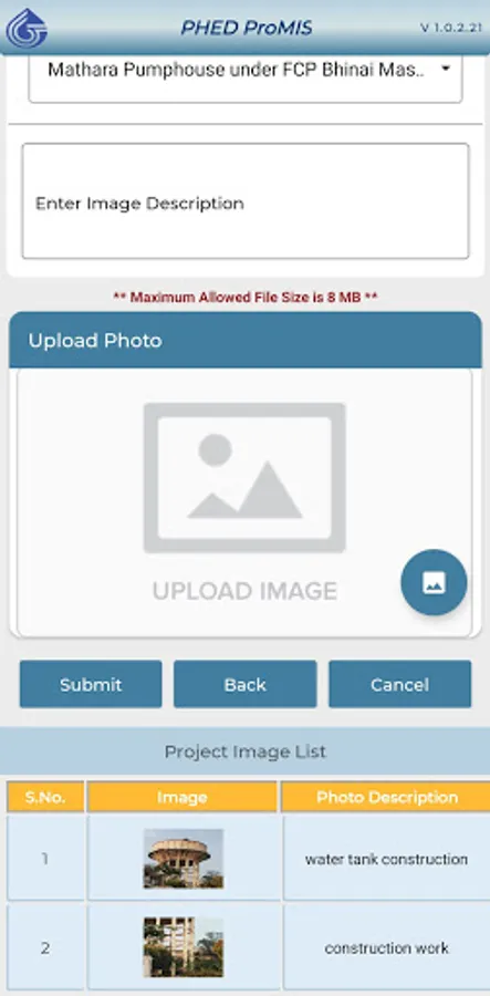 The mobile app facilitates to all divisions/circles/region offices for uploading of photographs of their various project sites for monitoring the progress of projects.