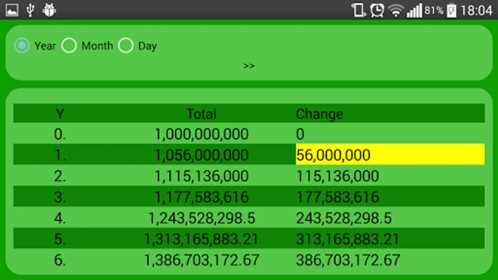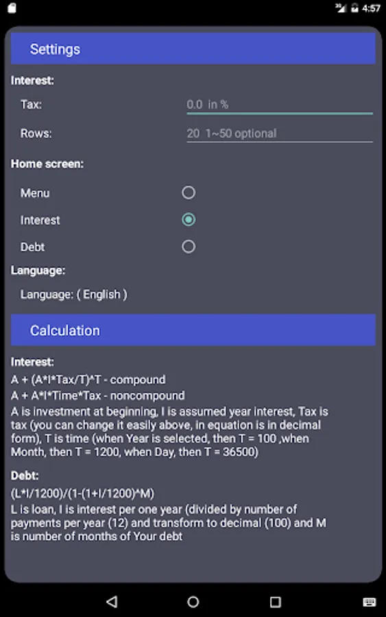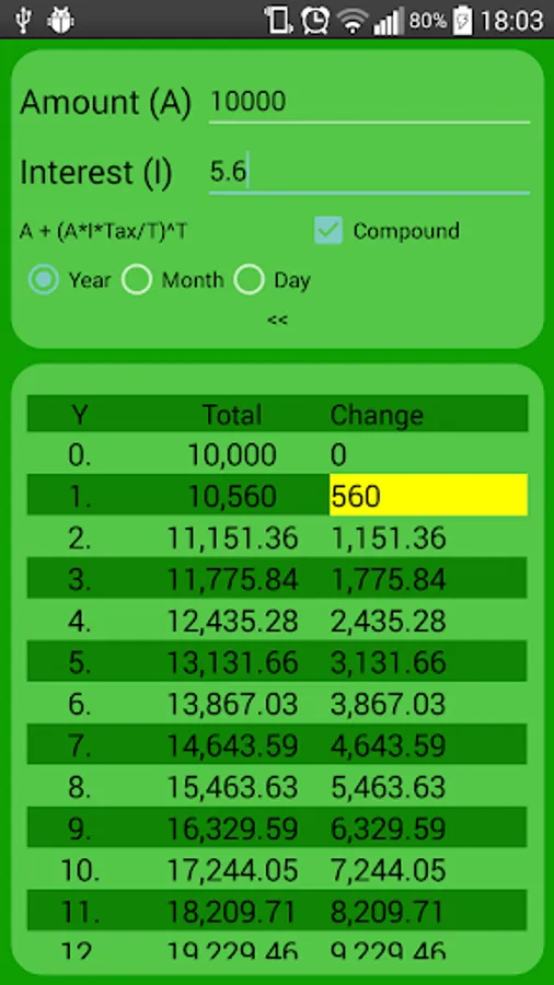 simply write Amount ( in any currency !! ) and assumed annual interest rate and this app will tell you, what can you expect at end of year/month/day. In yellow background is value, which you will get every year/month/day ( if compound is selected, then it will rise in time )