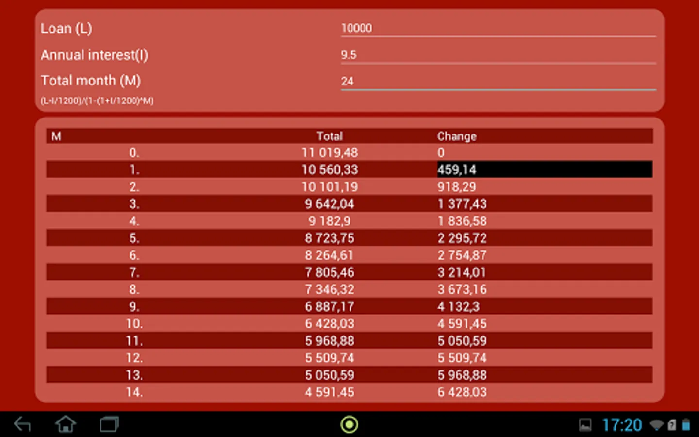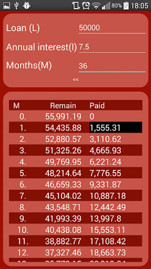 Just put amount of your loan, annual interest and time of repayment ( in months ) and this app will show you, how your loan decreasing every month. In black background is value, which you will pay every month.