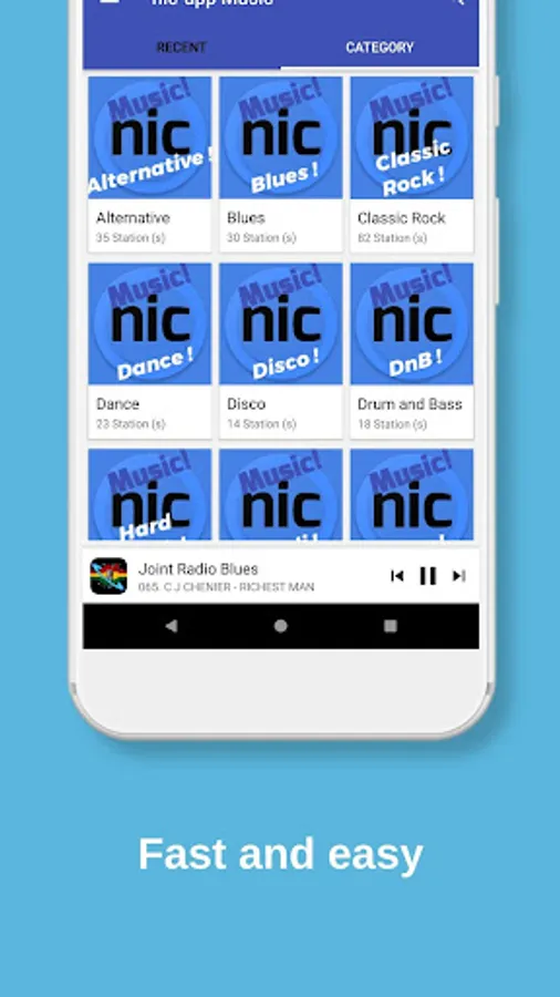 Currently with more than 400 music stations grouped in categories such as Alternative, Blues, Classic Rock, Hard Rock, Dance, Disco, Drum and Bass, Hindi, Jazz, New Age, New Wave, Pop, Rap, Reggae, Techno, Trance, and more.
